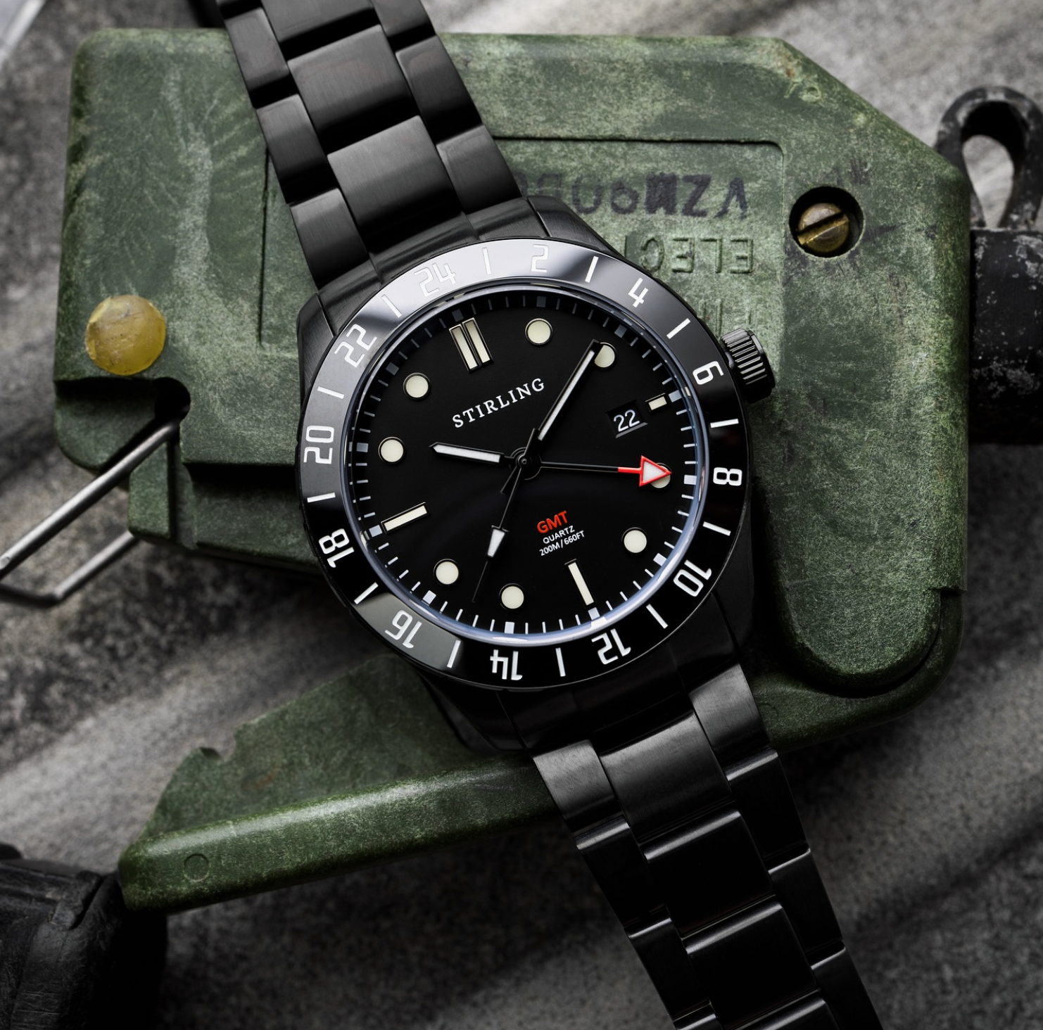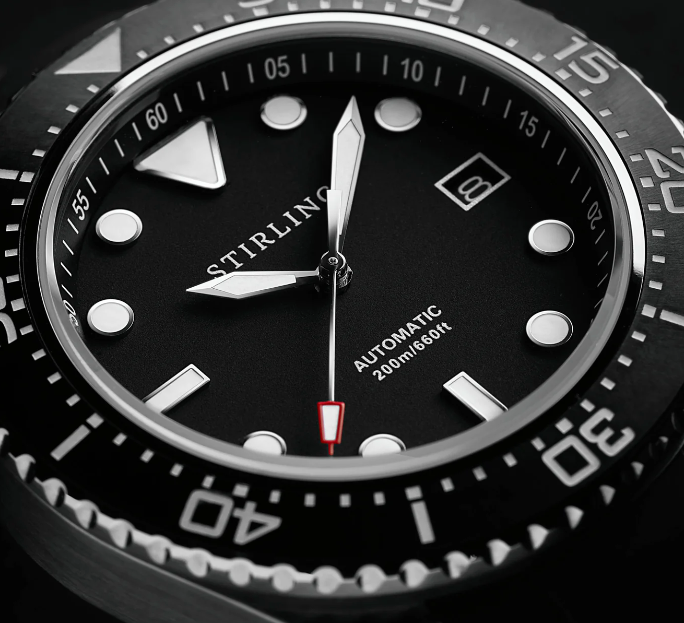 Cadran noir onyx avec boîtier résistant à l'eau en rouge dragon profond. Le nom Falcon est gravé à côté du six.