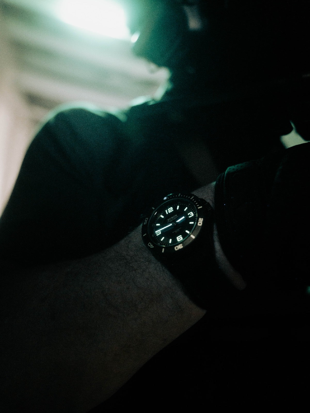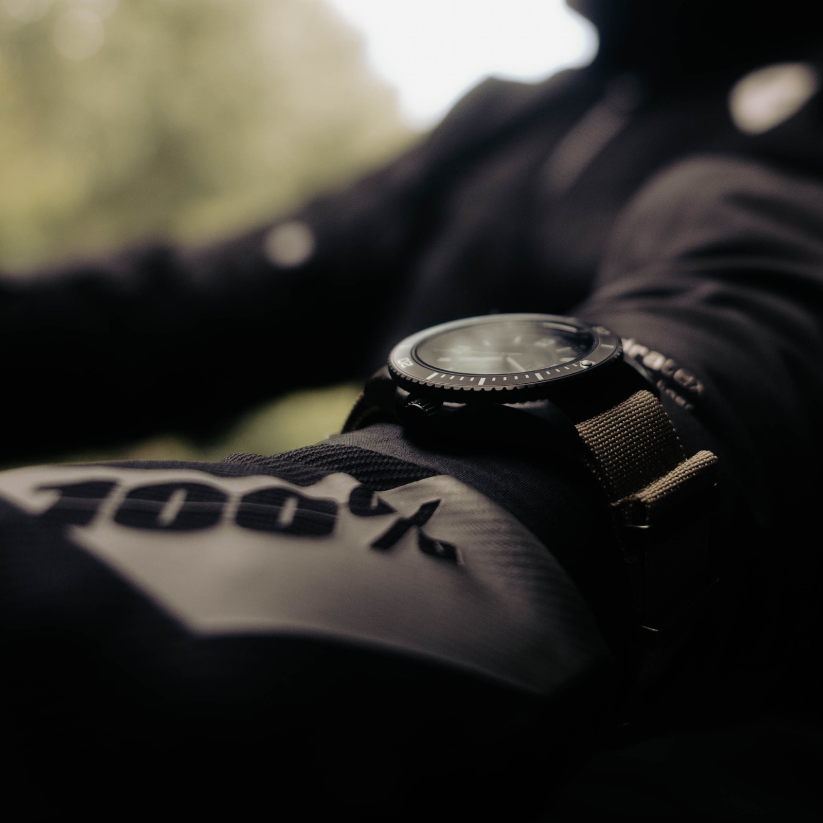 Onyx Black Dial with the water resistant in Lizard green. Our slogan built for the brave is graved close to the six.